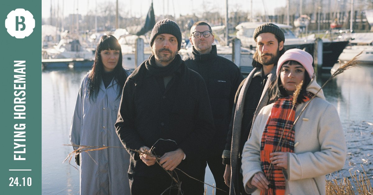 Flying Horseman is a unique musical collective from Antwerp that, since 2010, has been hypnotising headphone junkies and concertgoers alike with their most original, cinematic rock. Frontman Bert Dockx (Dans Dans) draws the listener in with his deeply felt vocals and fiery plucking of the strings. Loesje and Martha Maieu provide layers of spooky backings and lo-fi synths. The new rhythm section, with Louis Evrard and Max Dobbertin, is adventurous and deeply groovy in surprising ways.
